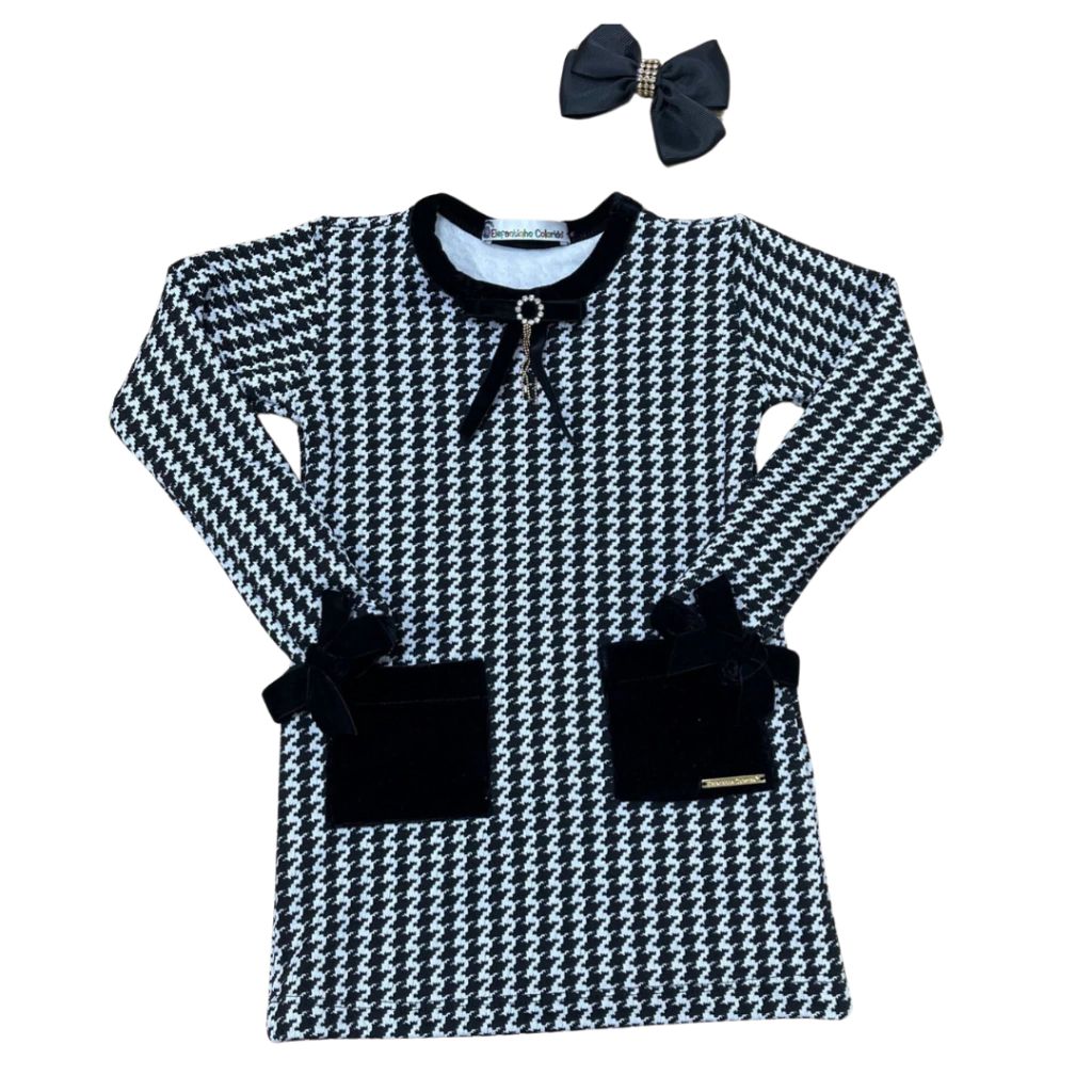 Confeccionado em veludo de alta qualidade, o vestido proporciona um toque suave e aconchegante, garantindo que sua filha esteja sempre confortável. A combinação de preto com branco traz um ar elegante, ideal para qualquer ocasião.